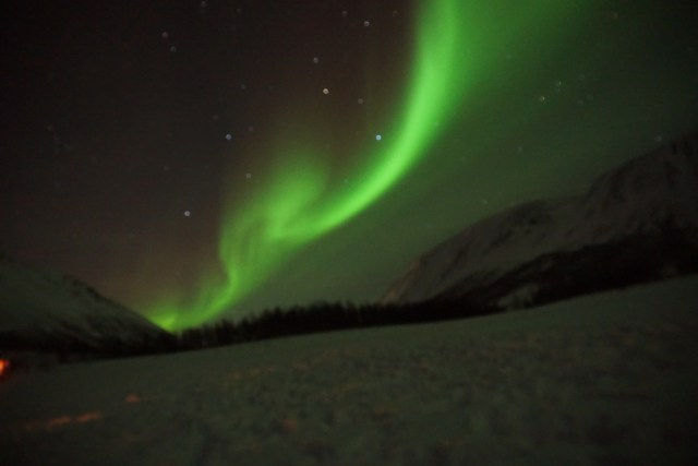 Dos noches después me llevé una sorpresa cuando la vi durante un rato, sobre la 1 de la mañana, justo cuando llegaba a la casa que tenía alguilada en Tromsø. En esta ocasión se veía muy tenue, porque las luces de las casas y farolas le restaban visibilidad. Había estado nevando toda la noche, así que seguramente se trababa del final de una Aurora que había estado oculta entre las nubes. Quién sabe, pero lo que sí que hice es entrar corriendo en casa a por la cámara y captar el momento.