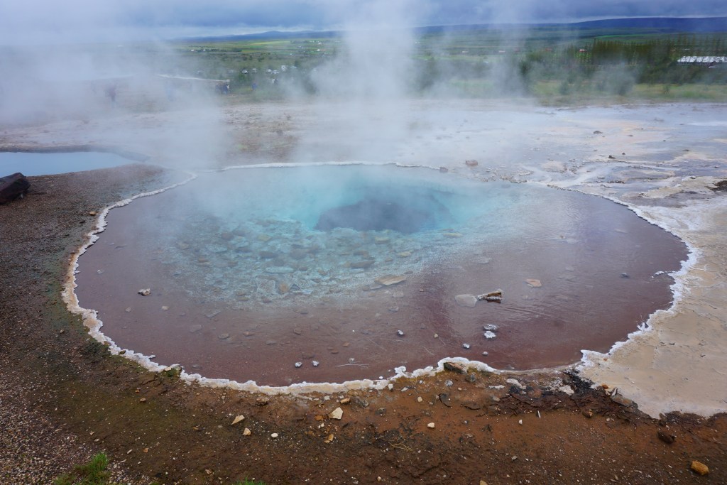 Después nos llevaron a la zona de géiseres a disfrutar del olor a huevo podrido, donde está el famoso Geysir, un géiser que está ahora inactivo (su última erupción fue en el año 2.000). Sin embargo, el espectáculo está asegurado con Strokkur, que cada 5-10 minutos escupe una buena columna de agua que puede elevarse hasta 25 metros. Intenta coger sitio delante porque se suele llenar de turistas.
