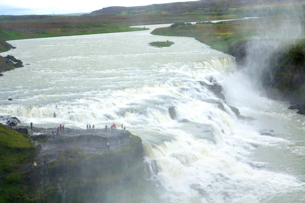 La siguiente parada fue la gran catarata de Gulfoss, una de las más impresionantes del país por su tamaño, por la cantidad de agua que lleva y por la fuerza con la que la arrastra. De hecho, el sonido que produce el agua es brutal y es imposible ver la caída por el vapor que genera. Existen diferentes puntos para verla desde diferentes perspectivas. Para llegar a la parte inferior hay que bajar por unas escaleras metálicas y continuar por una pasarela, en la que vete preparando para empaparte de agua, pero que realmente merece la pena porque llegas muy cerca del agua. Desde la parte de arriba se ve otra perspectiva diferente de la descomunal caída y del estrecho cañón por el que discurre el río. Ya que el guía nos dejaba un tiempo limitado en cada sitio, no daba para explayarse mucho, pero creo que en esta catarata merece la pena pasear y verla desde otros puntos.