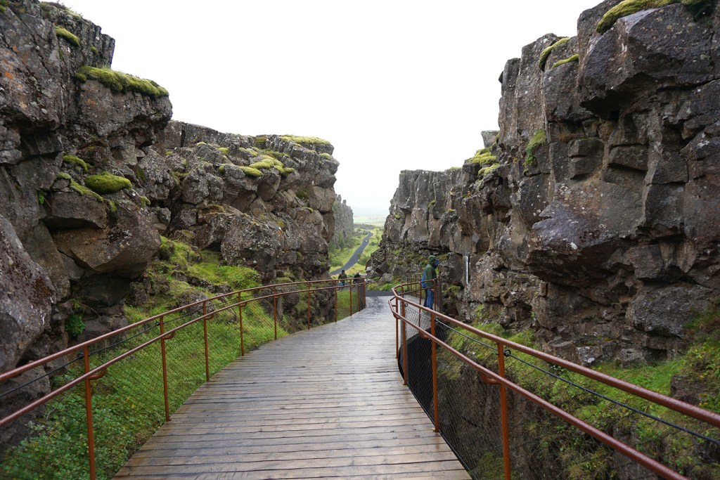 La última parada está en el Parque Nacional de Thingvellir. Aquí se encuentra la gran falla que separa la placa euroasiática de la americana. De hecho, es tan ancha que puedes pasear por ella, o incluso ¡bucear! Hicimos un recorrido de media hora con el guía del tour, que nos llevó a la zona en la que se estableció el parlamento islandés, fundado por los vikingos allá por el año 930, el primero de la democracia moderna.