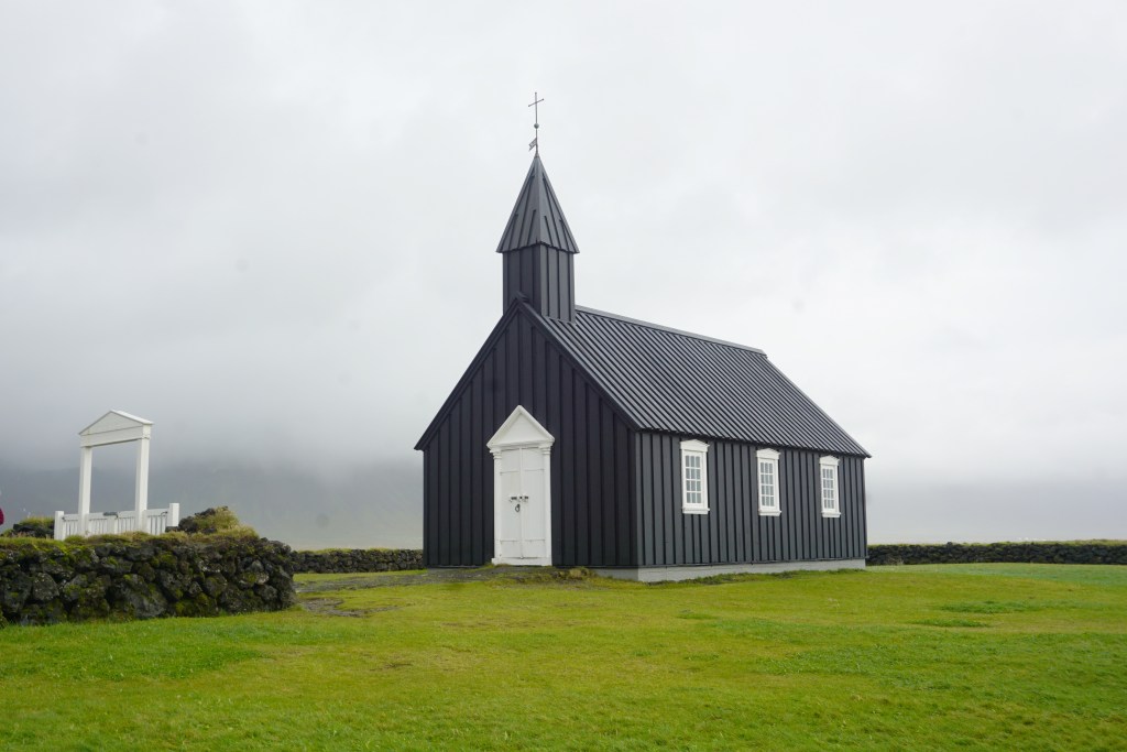 Buðahraun es una basta zona de formaciones de rocas de lava cubiertas de musgo (o nieve) que verás a ambos lados de la carretera en tu camino a la preciosa iglesia negra Búðakirkja, una de mis favoritas de Islandia, toda de color negro que contrasta con las ventanas blancas. Para llegar a ella, tan sólo tienes que tomar el desvío indicado con su nombre. Está situada cerca del mar y a tu espalda verás las montañas cortadas desde las que caen varias cataratas de gran altura, como la de Bjarnarfoss, que en los días que pega fuerte el viento, muy habitual en Islandia, verás el peculiar efecto del agua al subir en vez de caer.