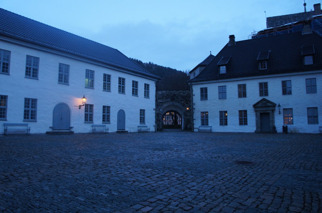 Si continuas andando más allá del Bryggen a lo largo del muelle, llegarás a la Fortaleza Bergenhus, rodeada de jardines de acceso público. No pude entrar a verla porque ya habían cerrado.
