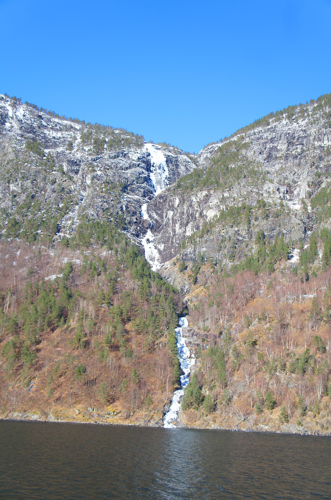 Cuando el autobús salió de Voss comenzaron a desfilar una colección de ríos, lagos y montañas nevadas. Según íbamos subiendo por carreteras estrechas y empinadas, los paisajes se hacían cada vez más espectaculares. A mi lado iba un señor holandés que me contaba que había estado en España muchas veces y que con mi cámara salían mejores fotos que su teléfono móvil. Un tipo simpático que viajaba con su mujer.
